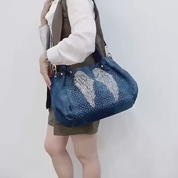 תיק ג'ינס מושלם בשילוב זרקונים בצורת כנפי מלאף להופעה נשית אופנתית חכמה
