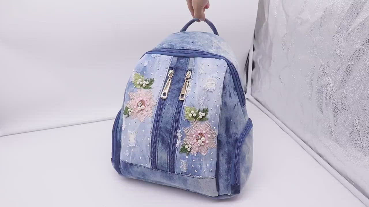 תיק מעצב מג'ינס מקורי בגיזרה קלילה ונשית בשילוב טלאי פרחים וחרוזי פנינה - לה איסלה
